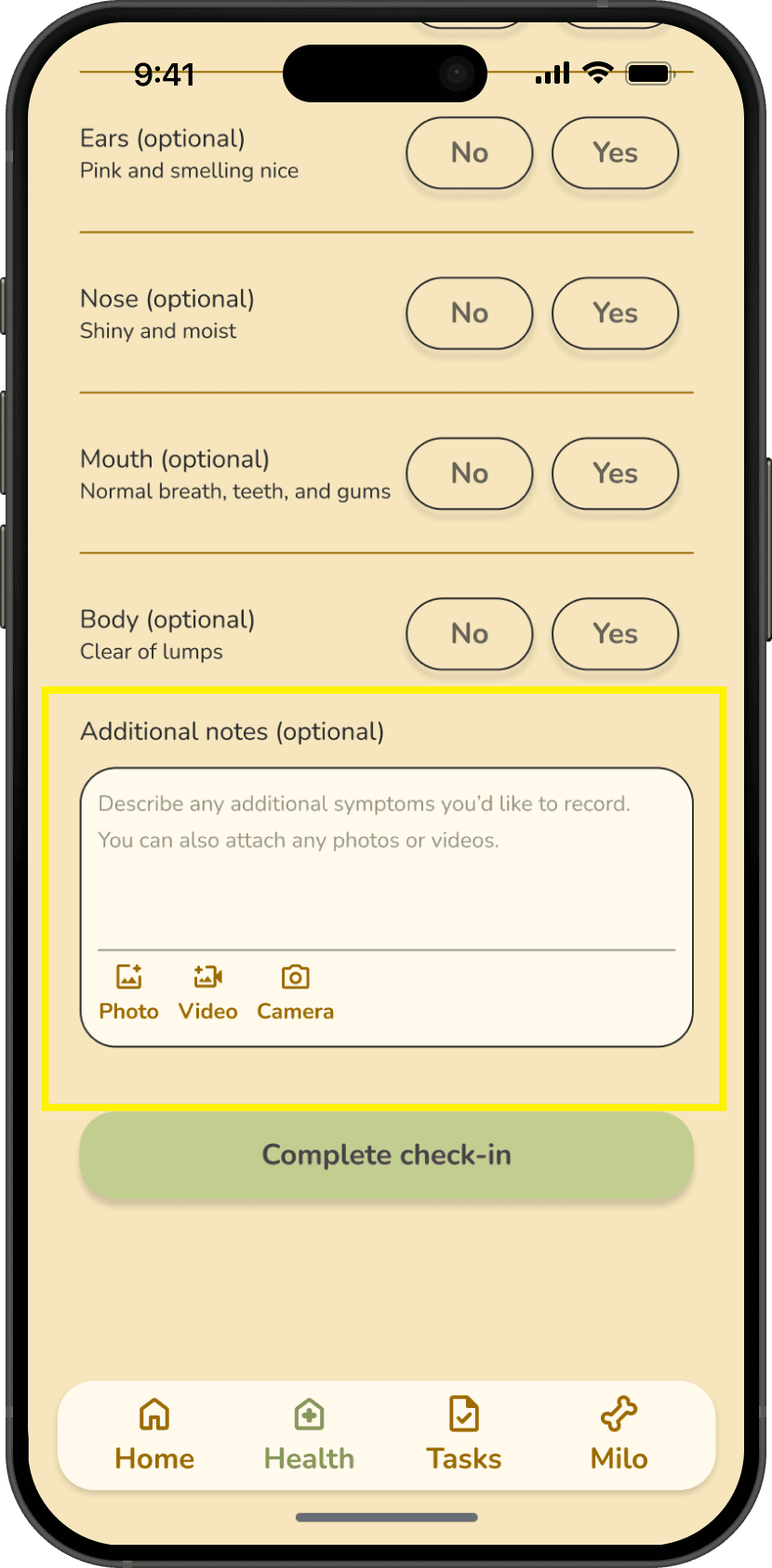 Based on usability testing data, I implemented support for notes and media attachments within the check-in flow to improve documentation accuracy and give users more flexibility when logging health observations.